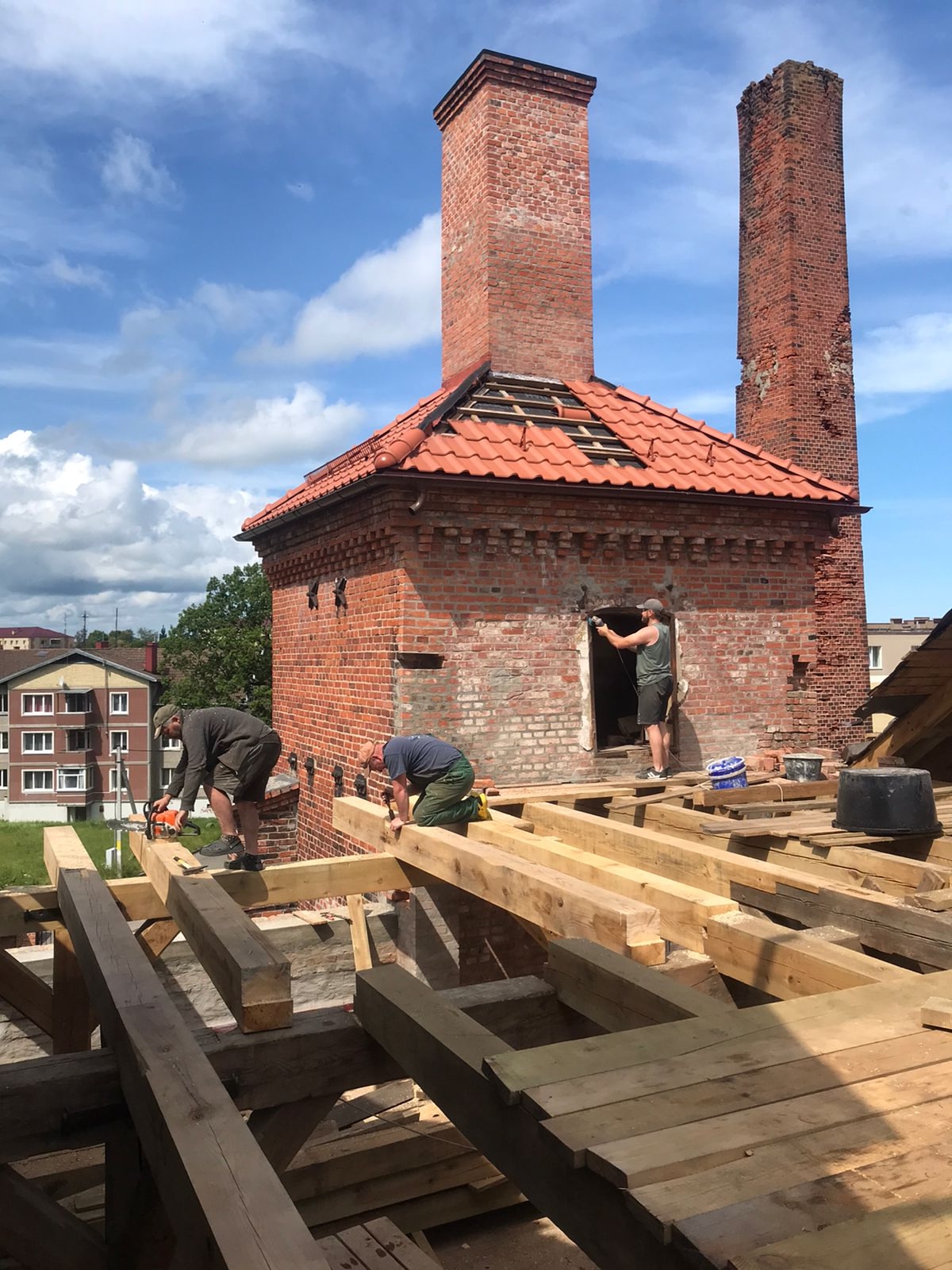 Продолжаем восстанавливать старинную пивоварню Бланкенштайн по старой 100-летней технологии! Приступили ко второму этажу под крышных помещений правого флигеля, надеемся к зиме уложить черепицу.